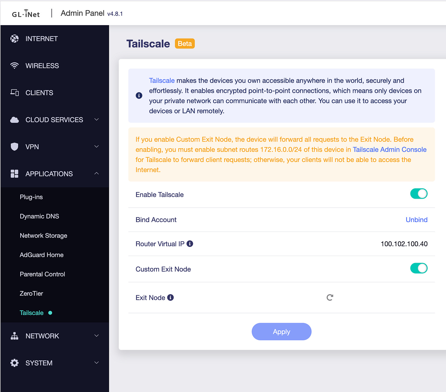If you have a GL.iNet device, login to the interface and go to the Tailscale tab under applications: