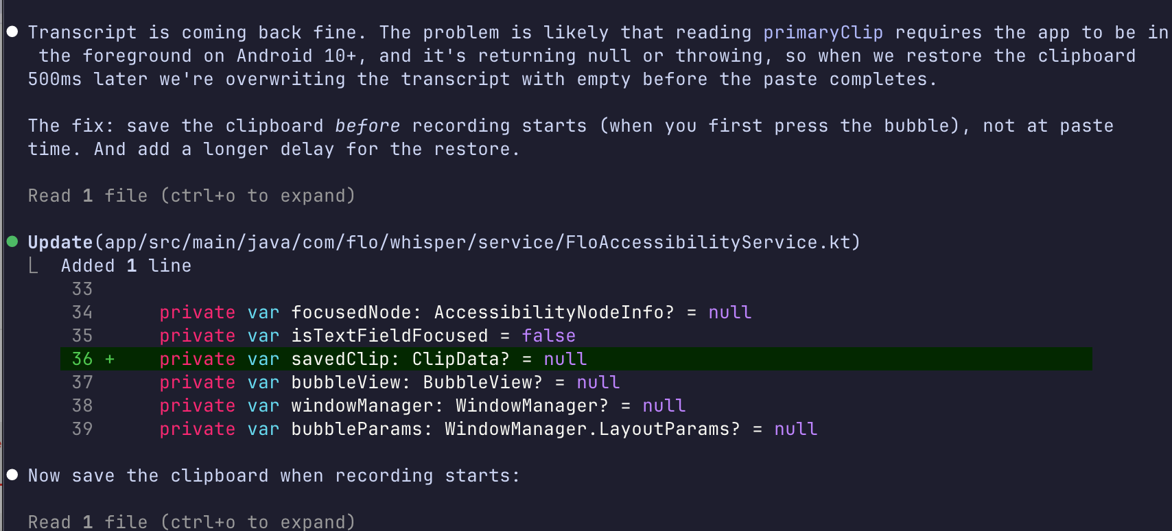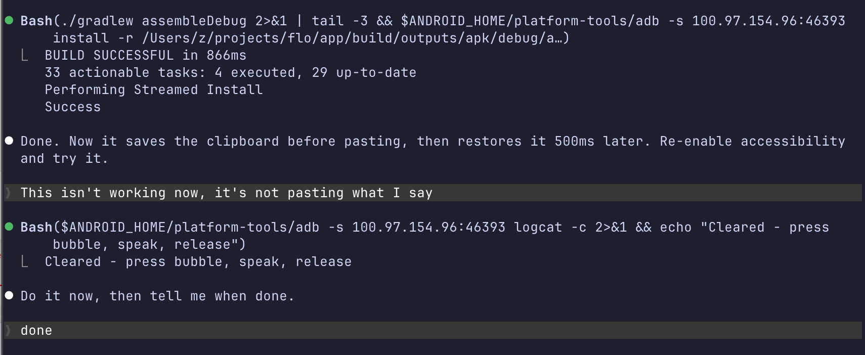 The reason I was able to build this so fast? I enable wireless debugging on Android and then let claude connect and run it. First try, the speech bubble didn’t work because of a bad api request / response parsing by the code.