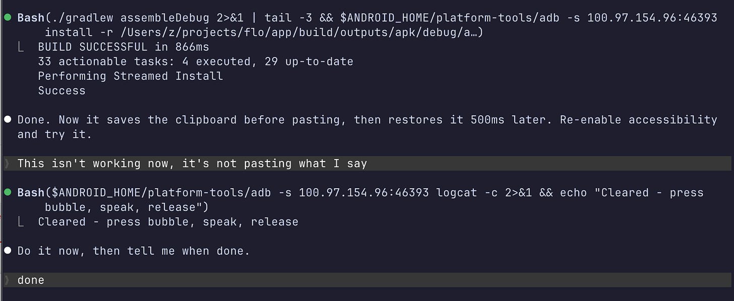 Since it can install right to my phone and view adb logs, I barely tell it what isn’t working and it iterates for me.